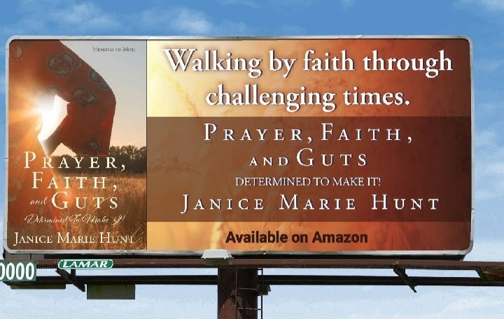 On June 20, 2022, a billboard of my book was on display. It was an amazing moment as I felt that I had given my mom her flowers and shared her testimony as I had hoped. Prayer, Faith, and Guts: Determined To Make It! is an easy read, and is available both in print and audiobook form on Amazon, and on Xulon Press's online bookstore.